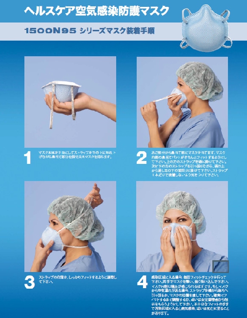 ●防塵マスクに液体(血液や体液を含む)が付着した場合、汚染した場所からすぐに離れてください。使用した防塵マスクマスクは廃棄し、新しいものと交換してください。