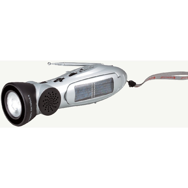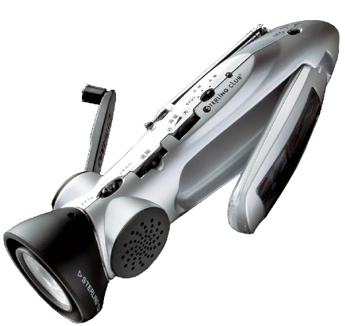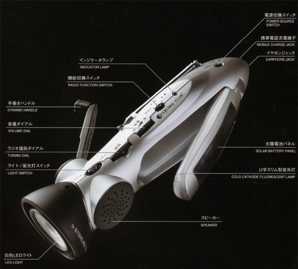 電池やAC/DC電源のほかにも、屋外では太陽電池やダイナモで、室内ではダイナモによって、闇を明るく照らすLEDライトや蛍光灯、ラジオやサイレンといった機能の使用が可能です。また、スターリングターボの名にふさわしく、携帯電話の充電器としても使用できます。