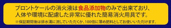 プロントケールは、人体や環境に害のない成分でできています。成分は、食品添加物にも使用されている人畜無害なものです。消化液剤を100倍に薄めると、肥料としても活用できます。 この消火液から発生する不燃性ガスと水蒸気により、火を瞬時に消し止めることができます。