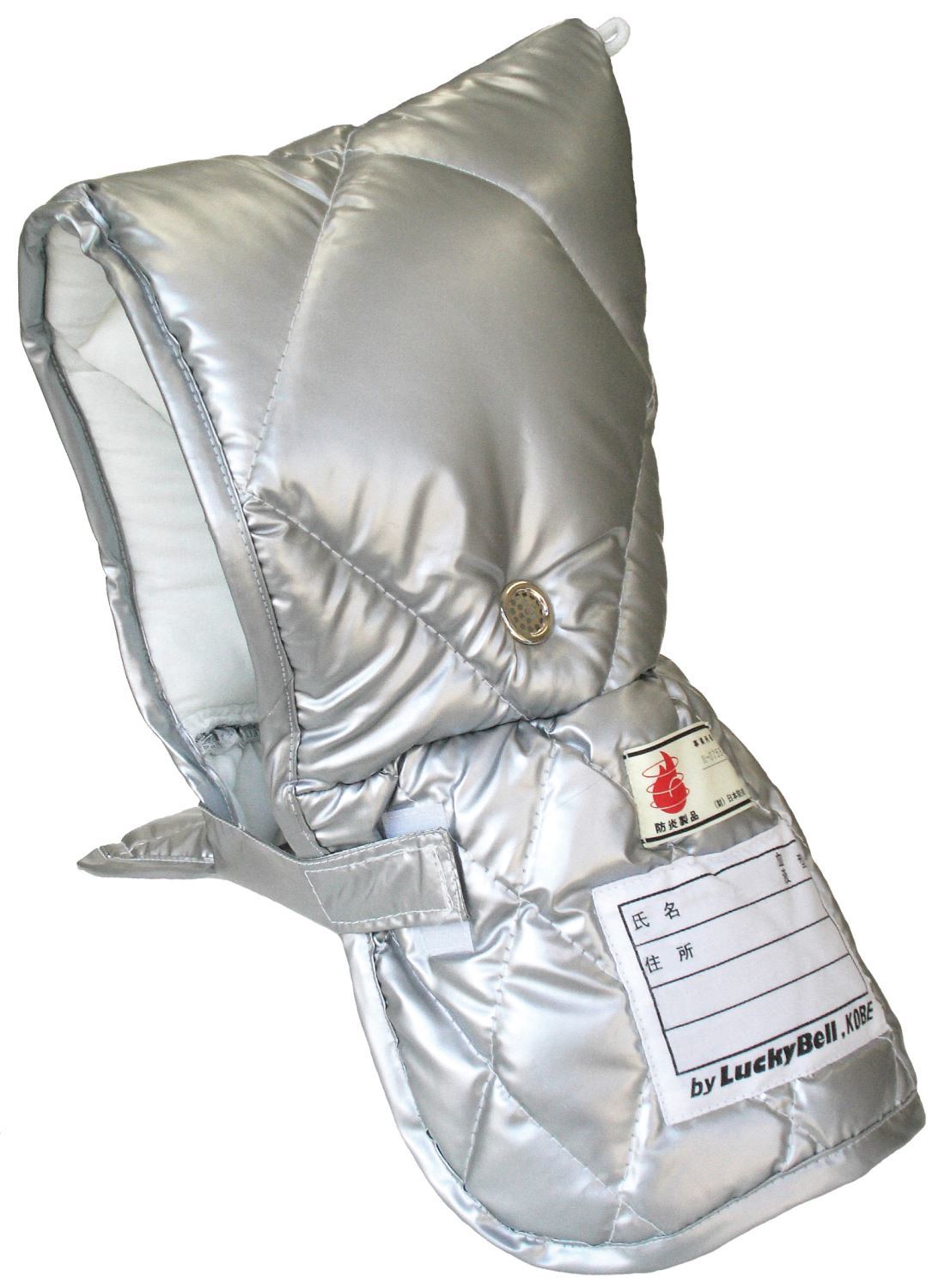 体の1番弱いと言われているのが頭です。頭はもちろんのこと肩までしっかり保護してくれます。 防炎・衝撃吸収、洗濯性能・毒性試験も合格し信頼の(公財)日本防炎協会認定商品です。 ワンタッチテープでしっかり留められ、耳の部分にはしっかり聞こえるようにアルミ穴を採用するなど工夫。