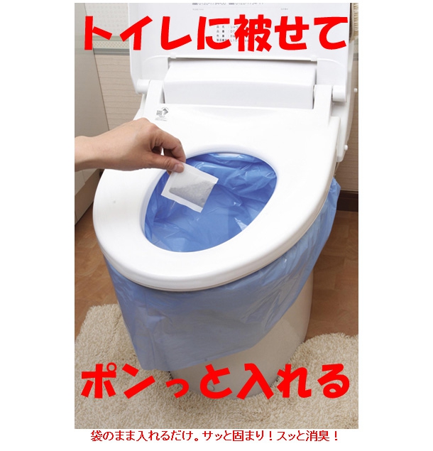 使い方は簡単!洋式トイレ、ポータブルトイレなどに汚物袋をセットして、排泄後に凝固剤を袋のまま入れるだけ。袋は自然に溶けて、わずか数十秒で水分を吸収、固化します。消臭性に優れた強力な活性炭入りだから、悪臭の発生も抑えます。