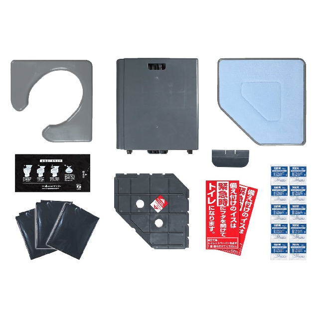 セット内容:トイレ本体×1個(本体・便座・フタ・底板・目隠し板・クッションシート各1個)、凝固剤×10個、汚物袋×10枚、簡易ポンチョ×3枚、表示シール×2枚