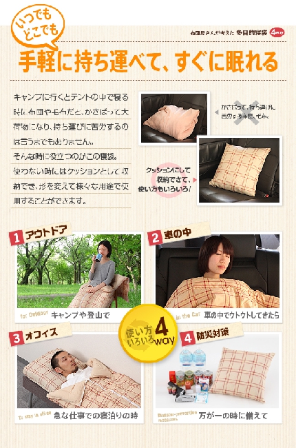 そんな時に役立つのがこの寝袋。使わない時にはクッションとしてコンパクトに収納でき、形を変えて様々な用途で使用することができます。