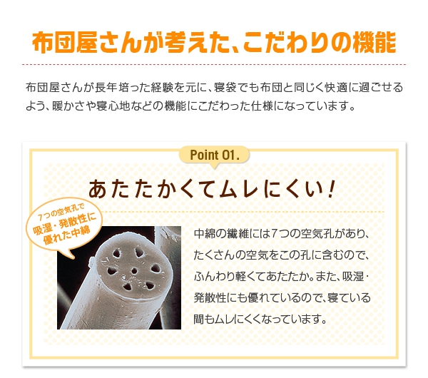 布団屋さんが長年培った経験を元に、寝袋でも布団と同じく快適に過ごせるよう、