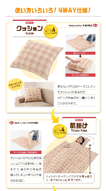 クッションの中から取り出して広げれば肌掛けになるので、車の中で家族が眠ってしまった時には毛布の代わりに。