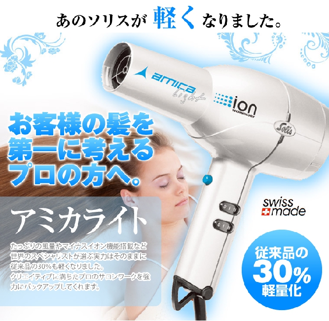 ソリスのドライヤーは、圧倒的な風量で他社との差別化を図ります。なかでもこのアミカは、ソリス社最軽量のドライヤーです。