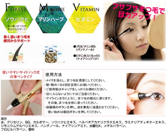 主となる天然成分は、ソウハク(長く濃いまつ毛を根本からサポート)マリンハーブ(ダメージまつ毛の補修と強化)ビタミン(まつ毛を内側から補修)の3種類です。